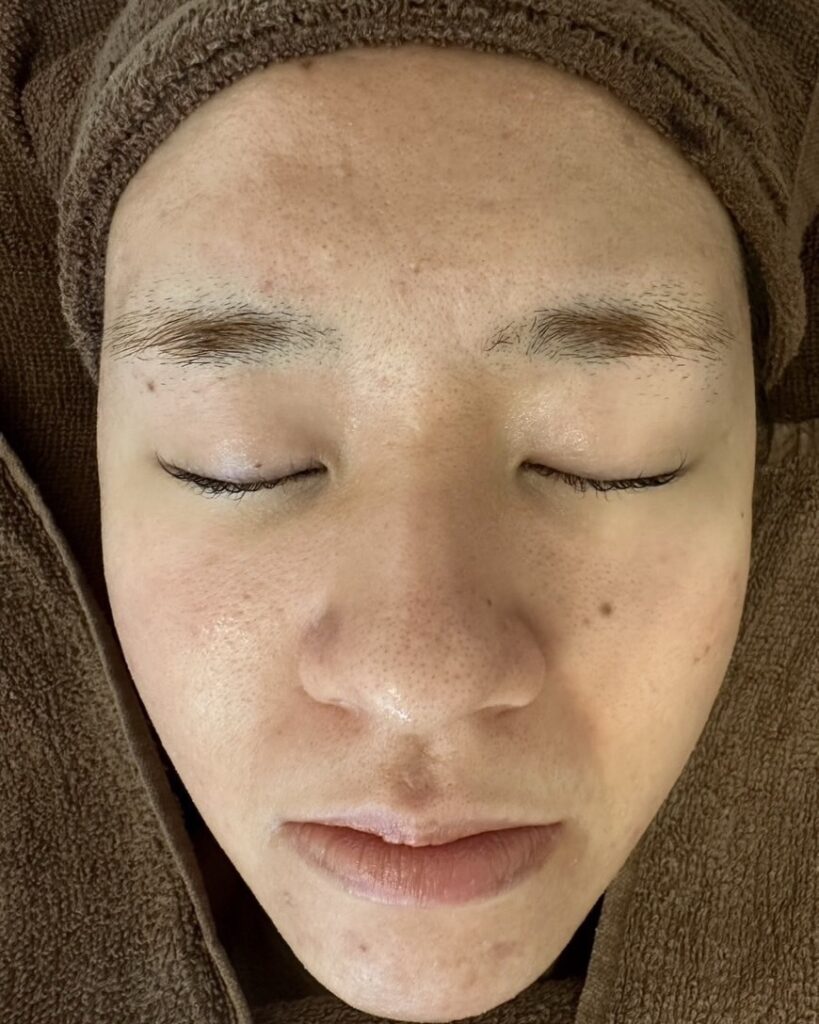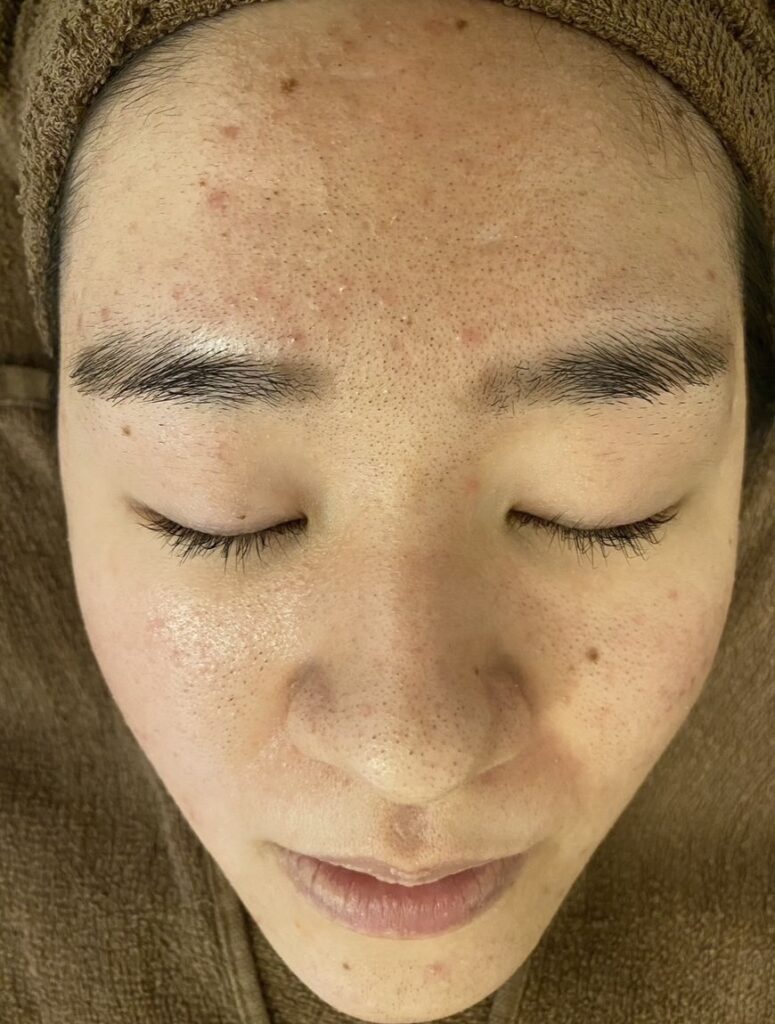 初回来店時は、フェイスラインに赤みを伴うニキビが繰り返し出ており、特に生理前や疲れが溜まったときに炎症が悪化しやすい状態でした。