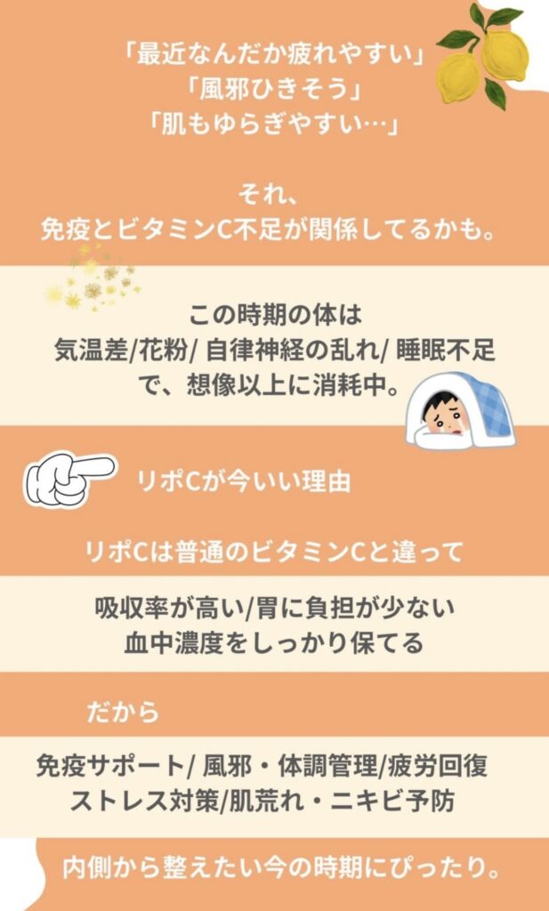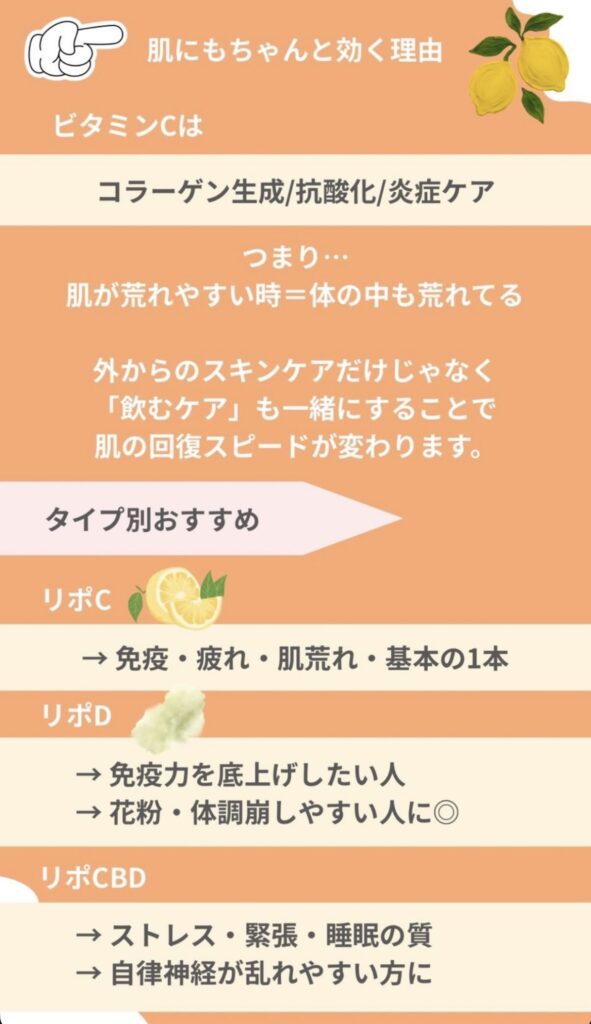 2026年2月26日 / 最終更新日時 : 2026年2月26日 ベライト様アカウント NEWS 今の時期、なんでリポC?🍋 Screenshot Screenshot 🔸リポC → 免疫・疲れ・肌荒れの基本ケア 🔸リポD → 免疫力を底上げしたい方 → 花粉・体調を崩しやすい方 🔸リポCBD → ストレス・緊張・睡眠の質 → 自律神経が乱れやすい方 Screenshot XBlueskyCopy